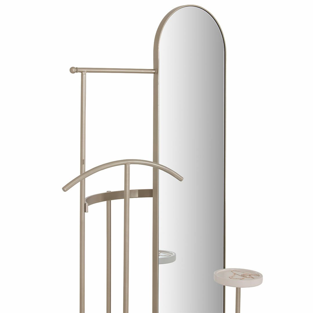 Ürün Malzemesi: Ayna metalik kum beji elektrostatik boyalı metal malzemeden üretilmiş olup tabanında grej ipek mat lake malzeme kullanılmıştır.