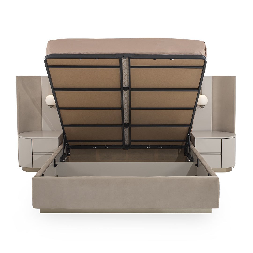 Blush Karyola, geometrik formları fonksiyonellik ile buluşturuyor. Sıcak bej lake tonları, kadife kaplı karyola bazası, özel tasarım aplik detayları, ile evinize uygun esnek bir yatak odası oluşturmanıza yardımcı oluyor.