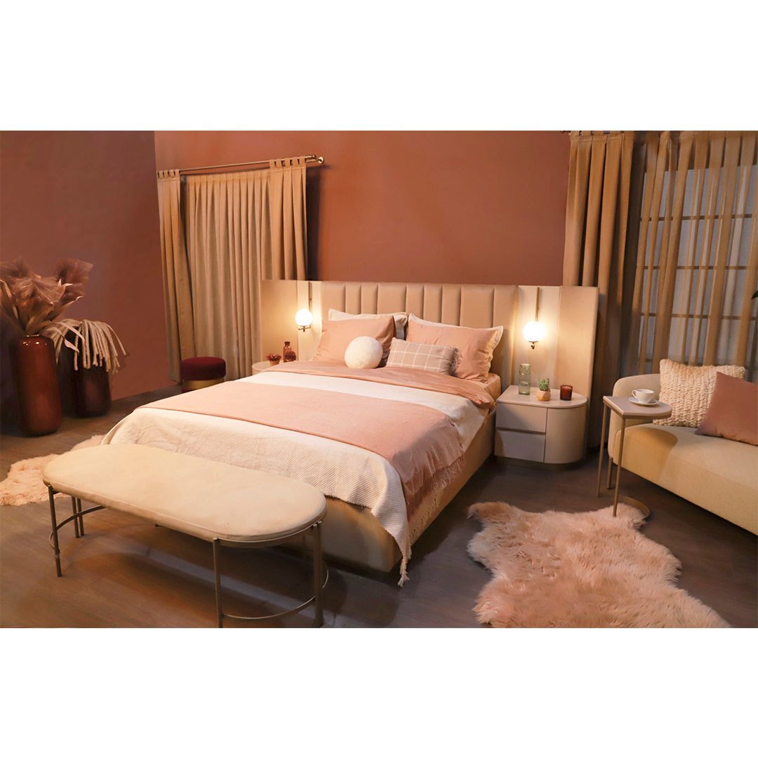 Blush Karyola, geometrik formları fonksiyonellik ile buluşturuyor. Sıcak bej lake tonları, kadife kaplı karyola bazası, özel tasarım aplik detayları, ile evinize uygun esnek bir yatak odası oluşturmanıza yardımcı oluyor.