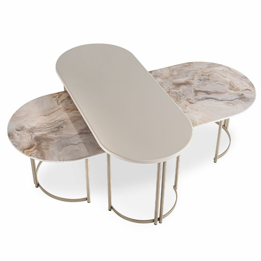 Üst Tabla Malzemesi: Büyük boy sehpa modelinde dijital görselleştirilmiş mdf malzeme kullanılarak mermer görünümü elde edilmiş olup, küçük sehpa modelinin üst tablası ise grej ipek mat lake malzemeden üretilerek soft bir doku kazandırılmıştır.