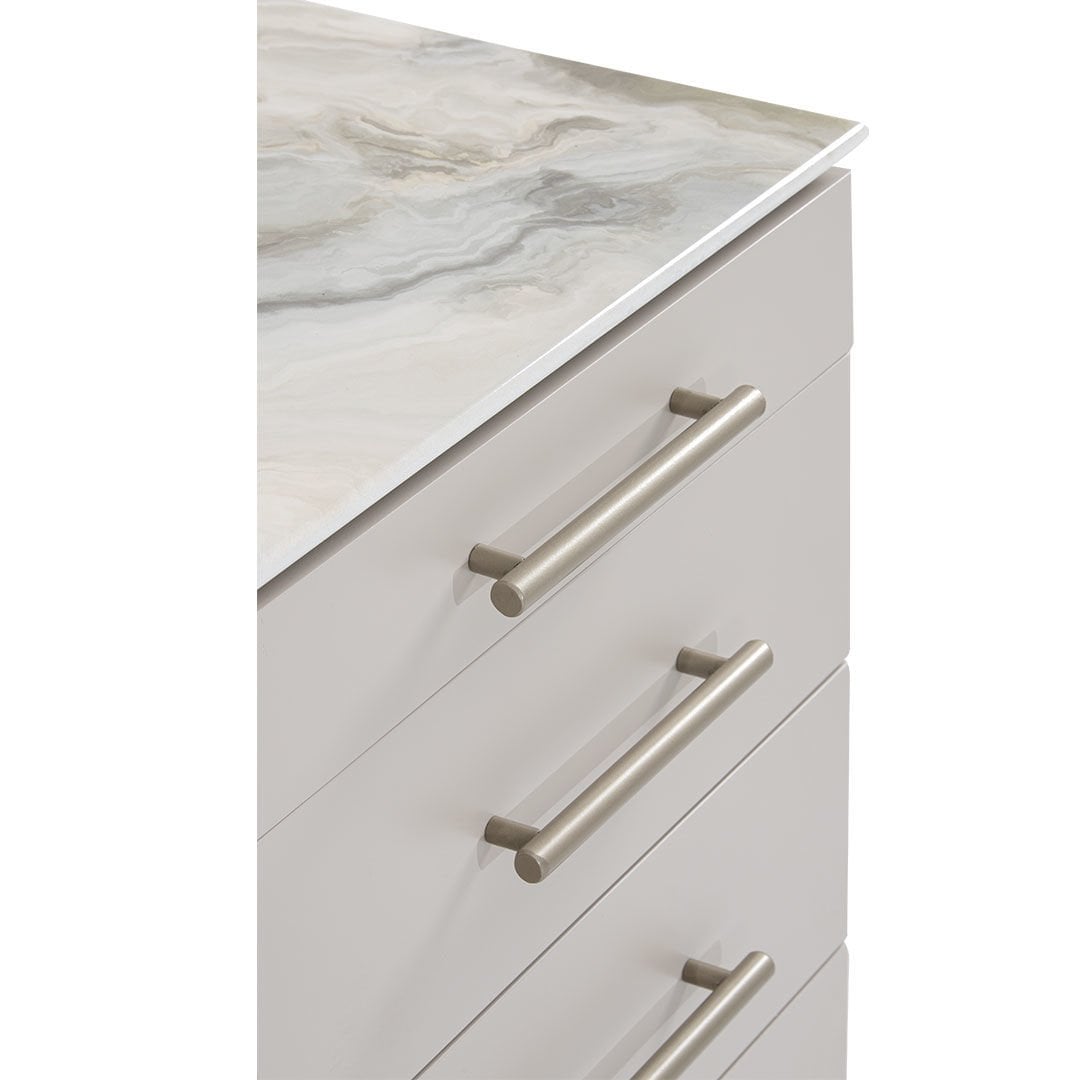 Şifonyer Malzemesi: Grej ipek mat lake mdf malzemeden üretilmiştir, şifonyer kulpları ve ayna çerçevesi metalik kum beji elektrostatik boyalı metal malzemeden üretilmiştir.