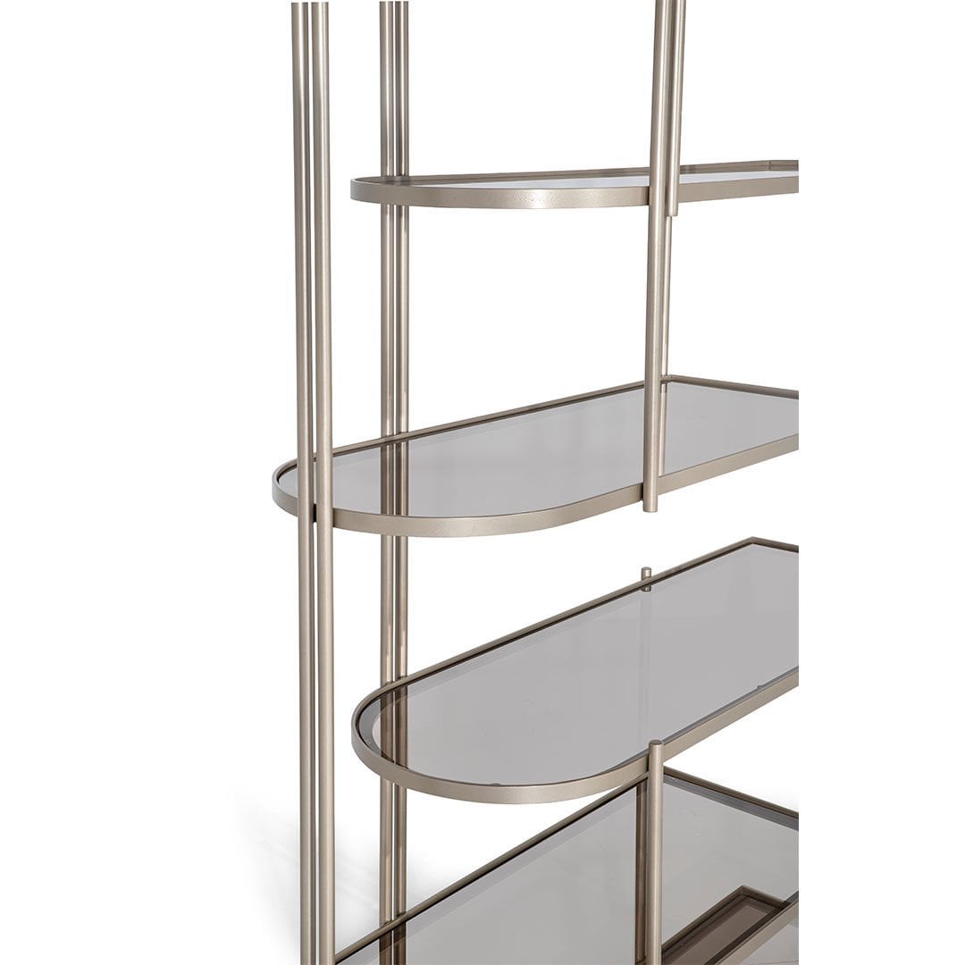 Kitaplık Ve Raf: Rafların metal kısımlarında grej ipek mat lake malzeme kullanılmış olup kitaplık bölmelerinde bronz cam kullanılarak naif bir görünüm kazandırılmıştır.