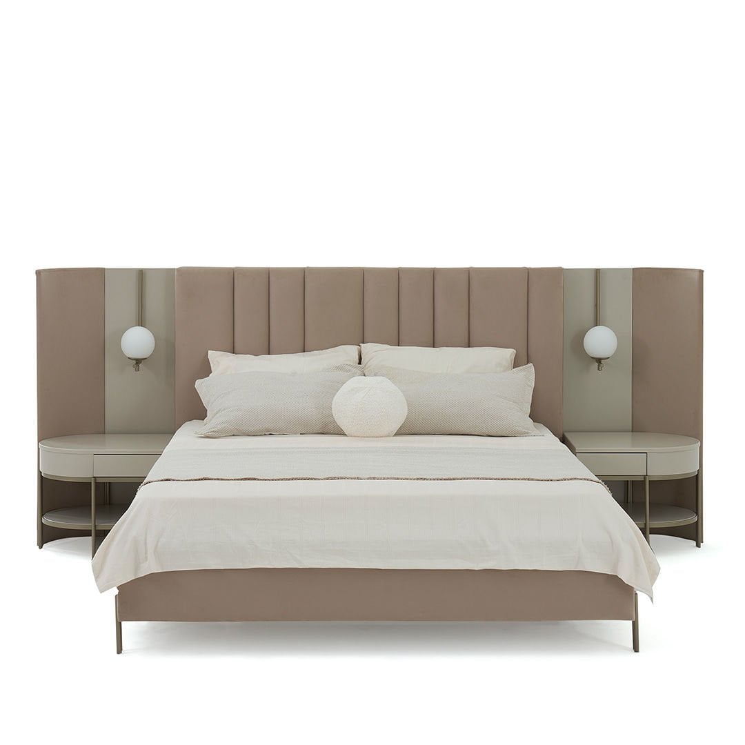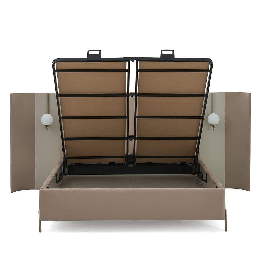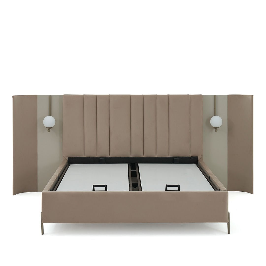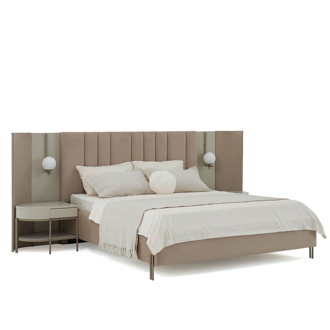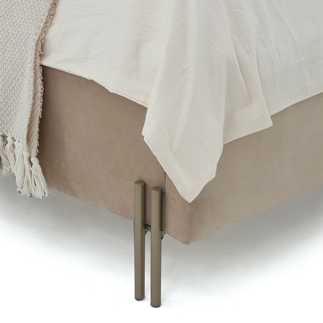 Blush Yüksek Ayaklı Karyola, geometrik formları fonksiyonellik ile buluşturuyor. Sıcak bej lake tonları, kadife kaplı karyola bazası, özel tasarım aplik detayları, ile evinize uygun esnek bir yatak odası oluşturmanıza yardımcı oluyor.
