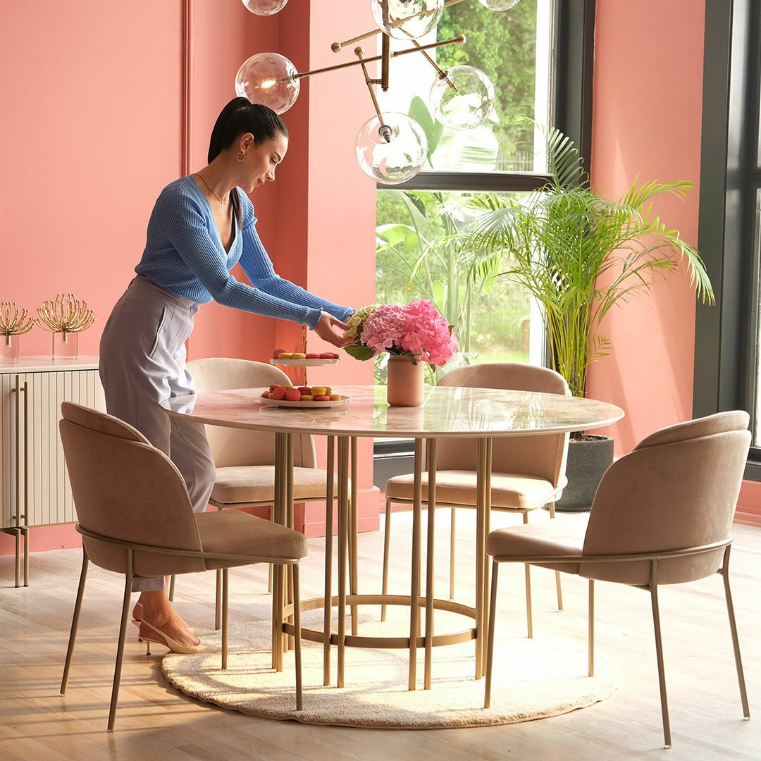 Dairesel formları metalik detaylarla birleştiren Blush Yuvarlak Masa yaşam alanlarına zarafeti ve şıklığı getirmeyi amaçlıyor. Hayatı kolaylaştırırken sadeliği ile de iç mekanlara ışıltı katıyor.