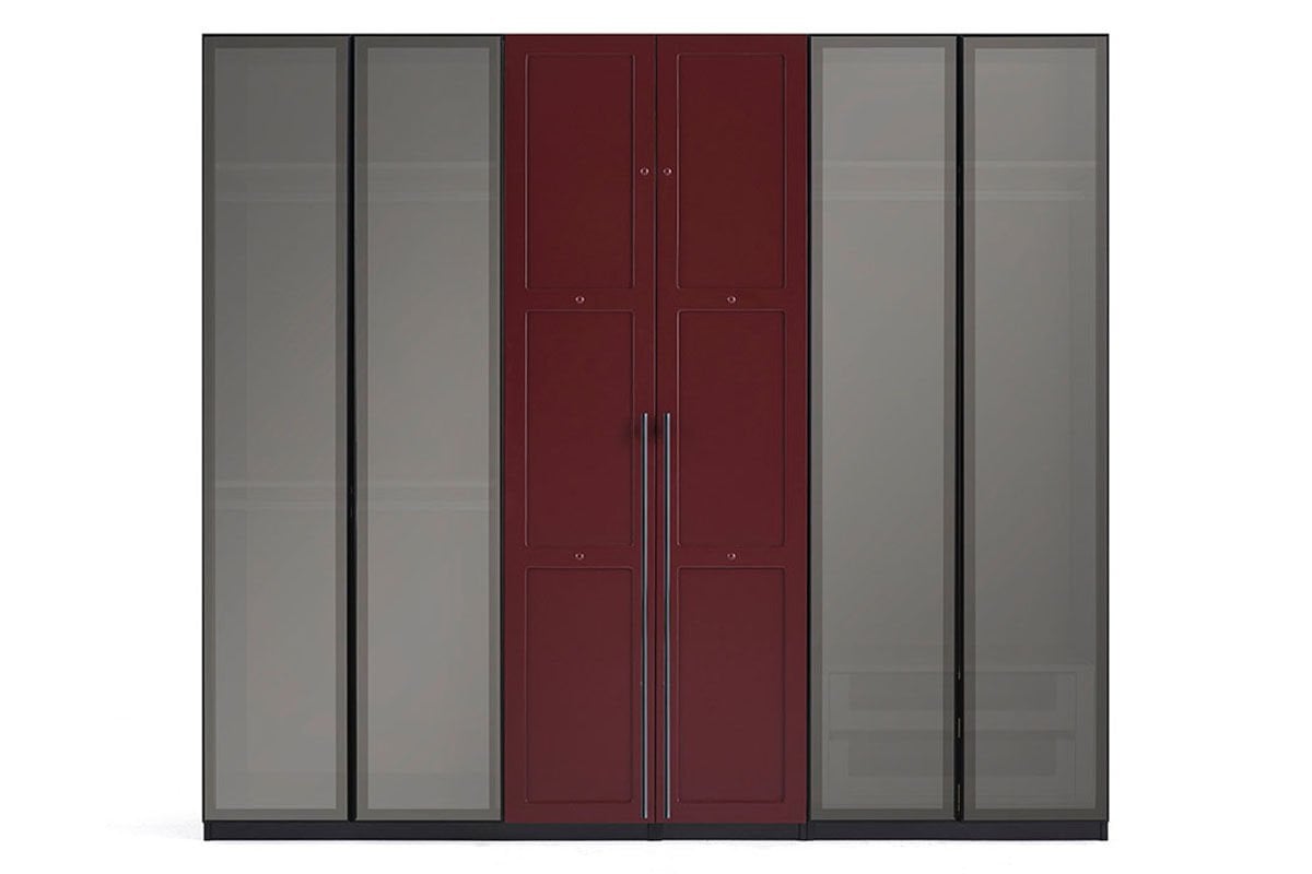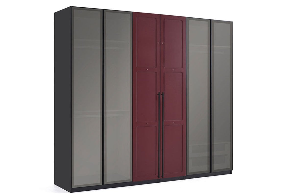 Dolap Malzemesi: Dolabın iki kapağı ve yan kısımları koyu bordo mat lake malzemeden üretilmiş olup, diğer dört kapakta füme cam kullanılmıştır. Dolap kulpları ise mat siyah elektrostatik boyalı metal malzemeden üretilmiştir.