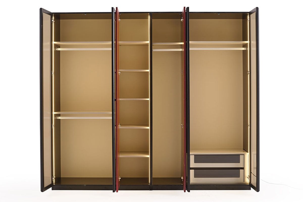 Fonksiyonları: Dolap içerisinde ışık sensörlü askılıklar, 2'li çekmece ve pantolonluk bulunmaktadır.