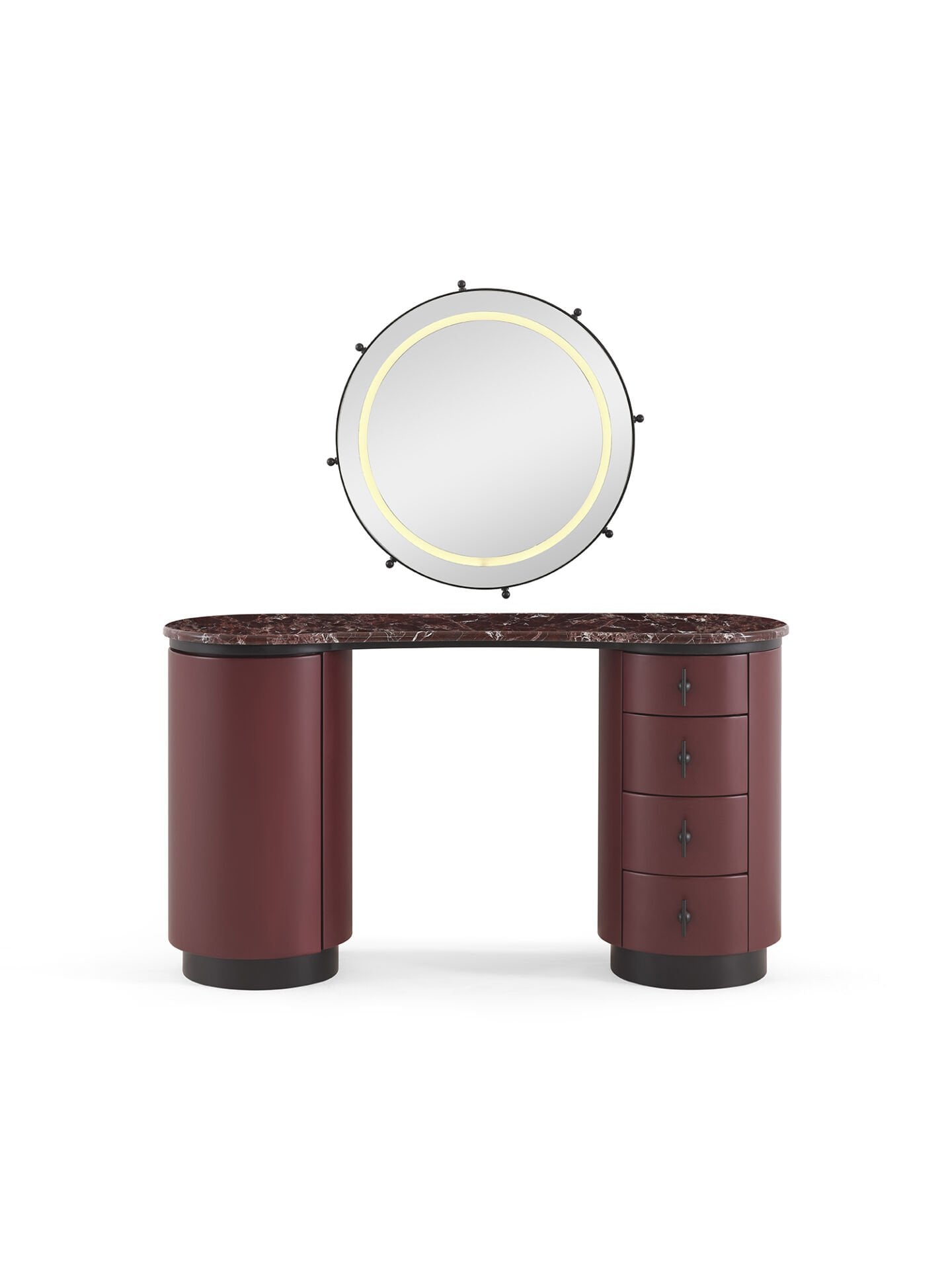 Şifonyer Malzemesi: Koyu bordo mat lake mdf malzemeden üretilmiştir, şifonyer kulpları ve ayna çerçevesi mat siyah elektrostatik boyalı metal malzemeden üretilmiştir.
