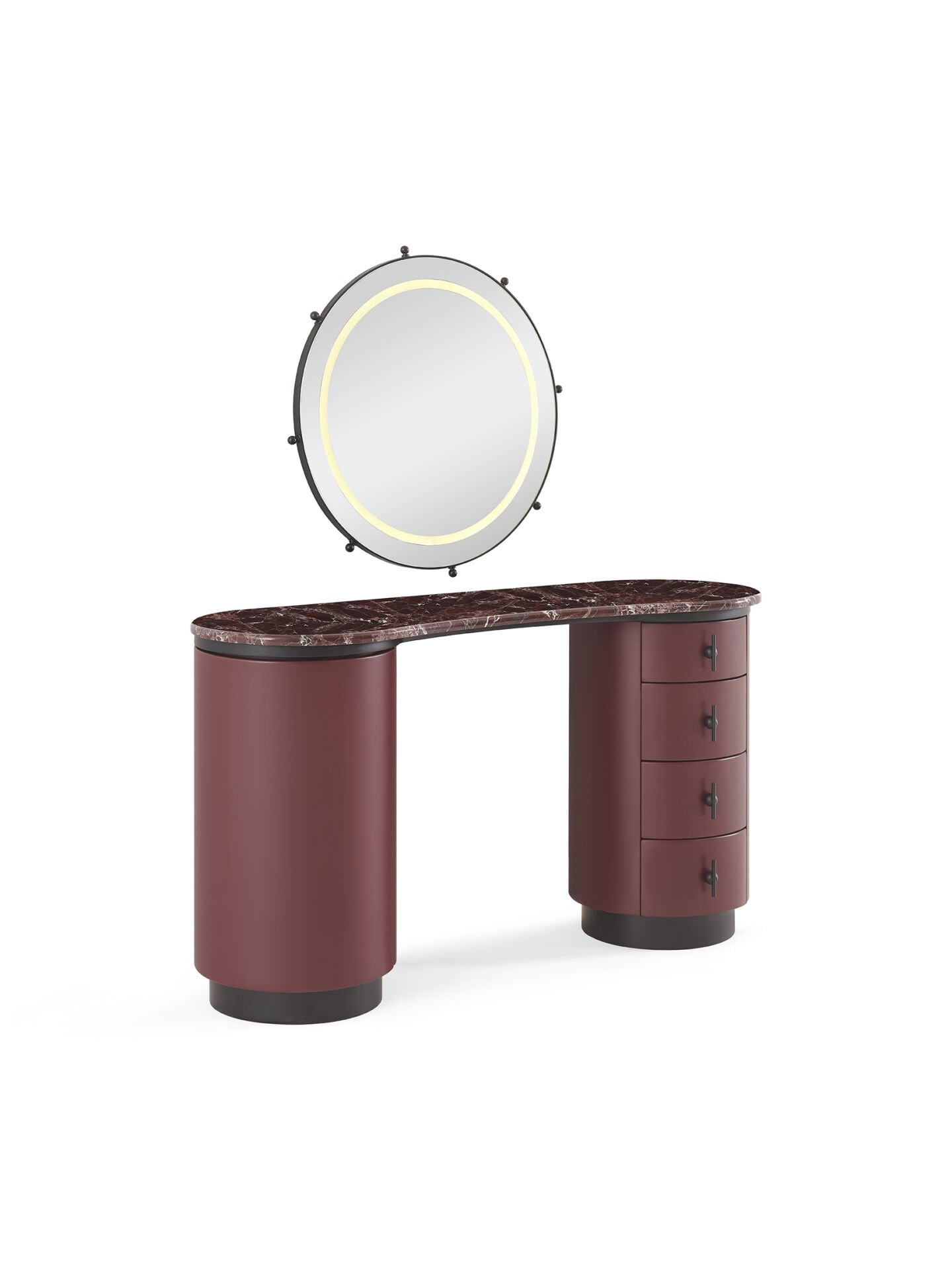 Marzen Yatak Odası, Mardin'de bereketin simgesi olan bordo üzüm ve nar tonlarından ilham alan rengi, yumuşak ve akışkan formlarla buluşturur. Mermer dokular ve mat siyah metal detaylar, yuvarlak ve oval çizgilerle dengelenerek sakin ve rafine bir atmosfer yaratır. Yatak, yumuşak yaslanma hissi veren başlığıyla konforu merkeze alırken; entegre başucu lambası ve USB girişi modern ihtiyaçlara estetik bir çözüm sunar. İnce metal ayaklar tasarıma hafiflik katar. Tek ve çift çekmeceli komodin seçenekleriyle şifonyer, dolap ve makyaj masasında da aynı akıcı tasarım dili sürdürülür. Farklı dolap modül ve ölçü alternatifleri esnek kullanım sunarken, makyaj masalı dolap modülü depolama ve kişisel alanı tek bir yapı altında birleştirir.