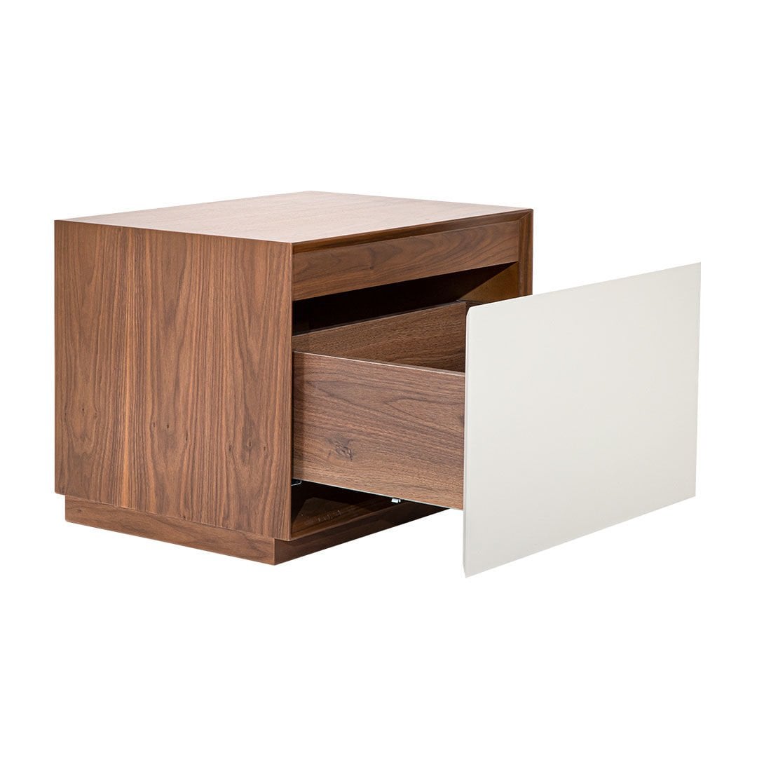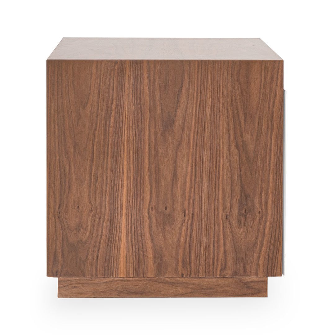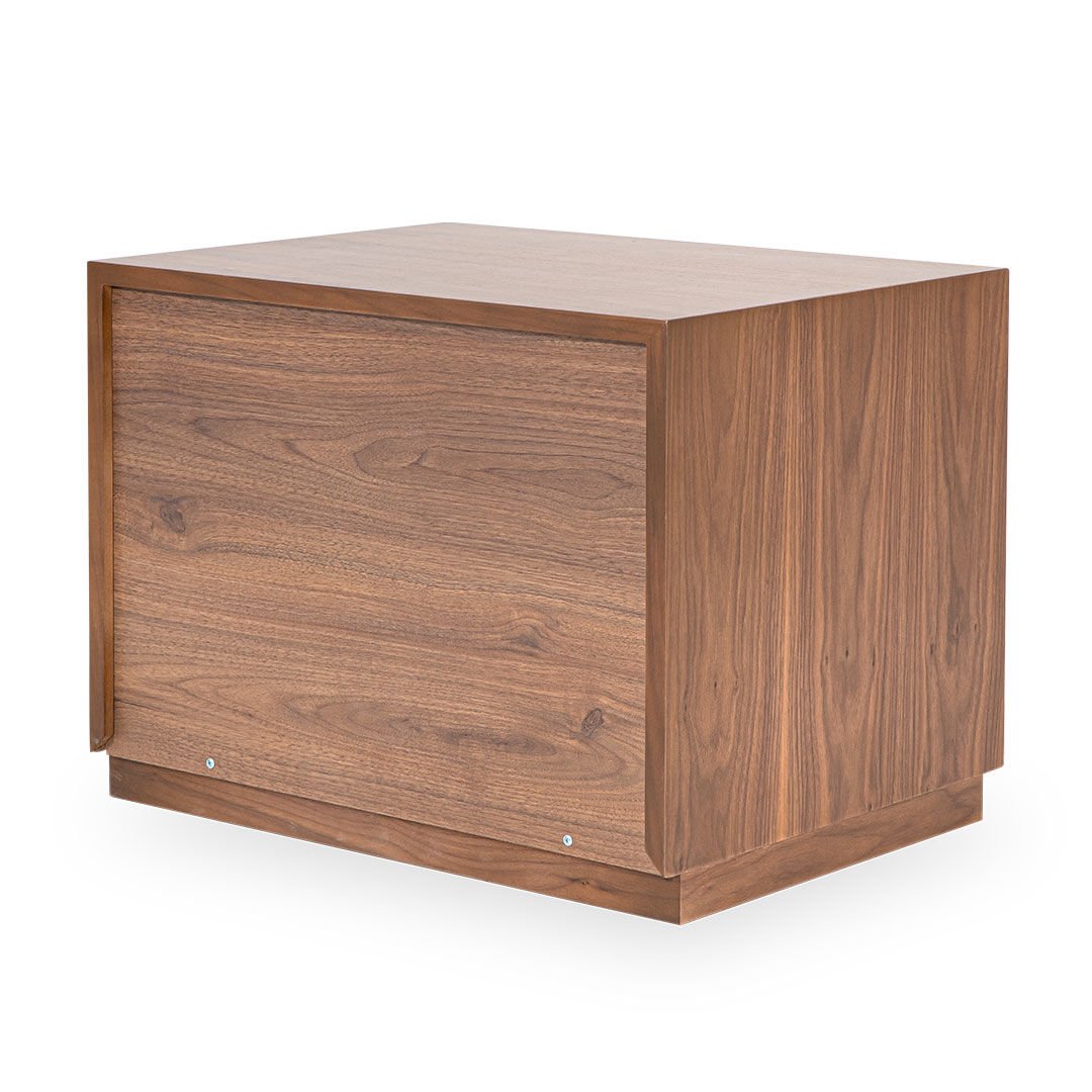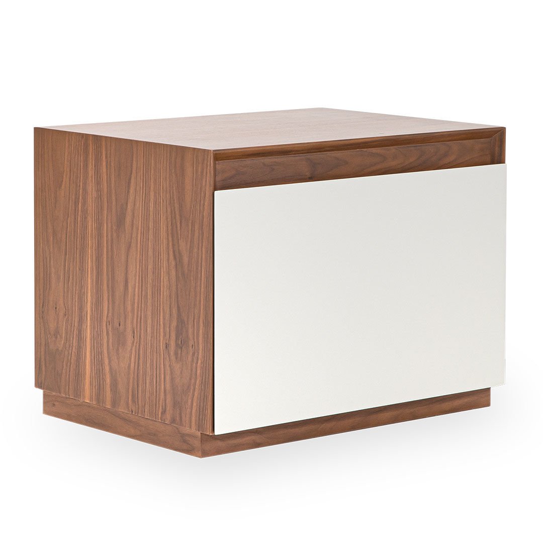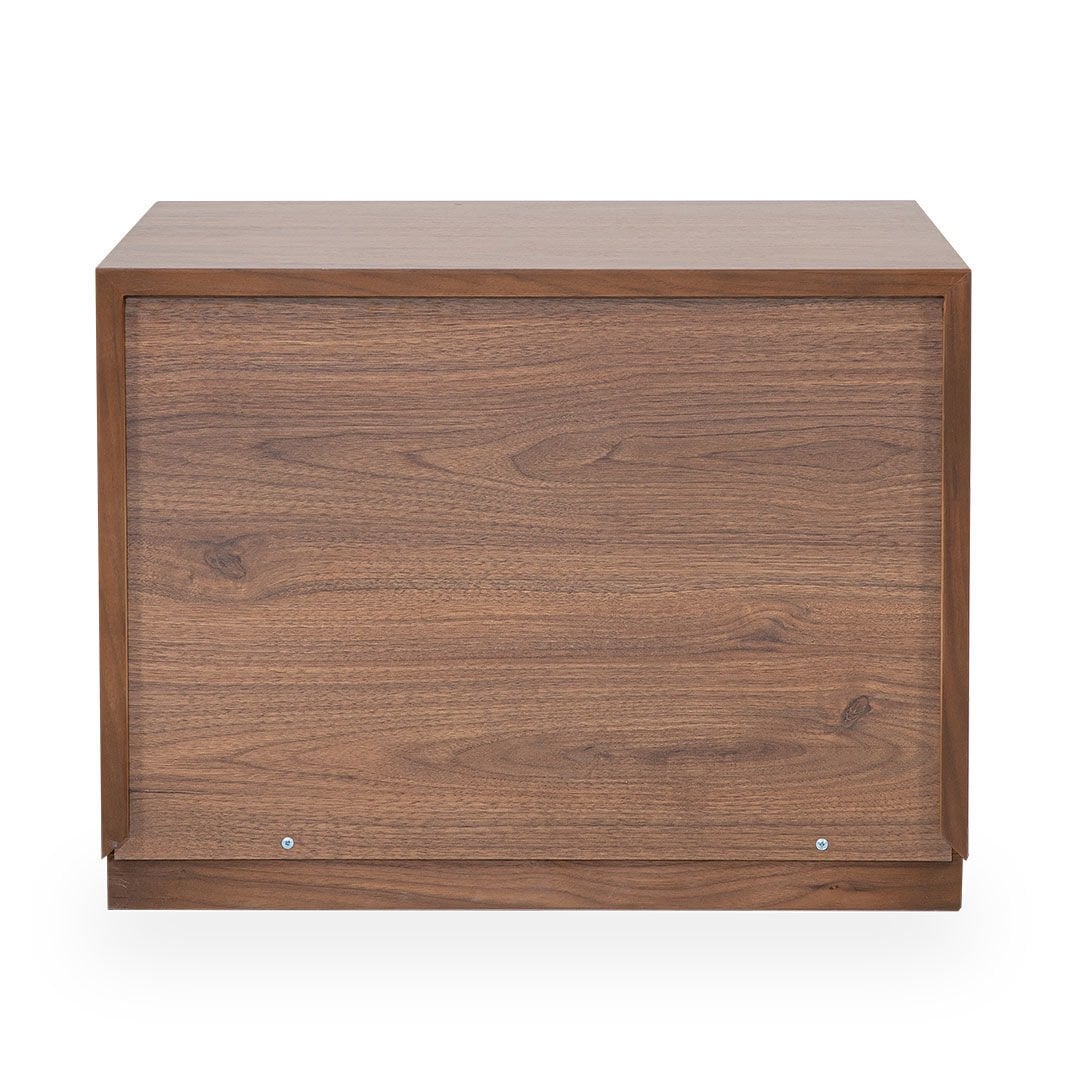 Ürün Malzemesi: Doğal hareli amerikan ceviz kaplama malzemeden üretilmiş olup komodin ön yüzünde çakıl taşı mat lake malzeme kullanılımıştır.