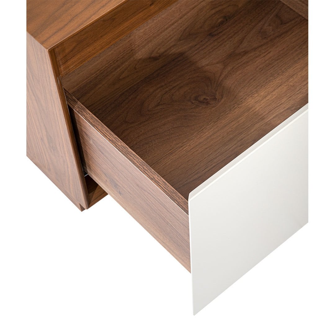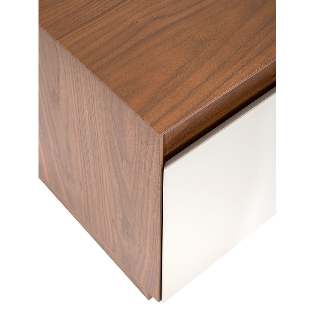 Hareli ceviz kaplamanın doğal estetiğini özgün malzeme kombinleriyle zenginleştiren Sacramento Komodin, göz alıcı tasarımı ve fonksiyonel özellikleriyle stilize bir mekan yaratıyor. Çakıl taşı lake kombinasyonuna eşlik eden ahşap yüzeyler yatak odalarında şık ve rafine bir etki bırakıyor.