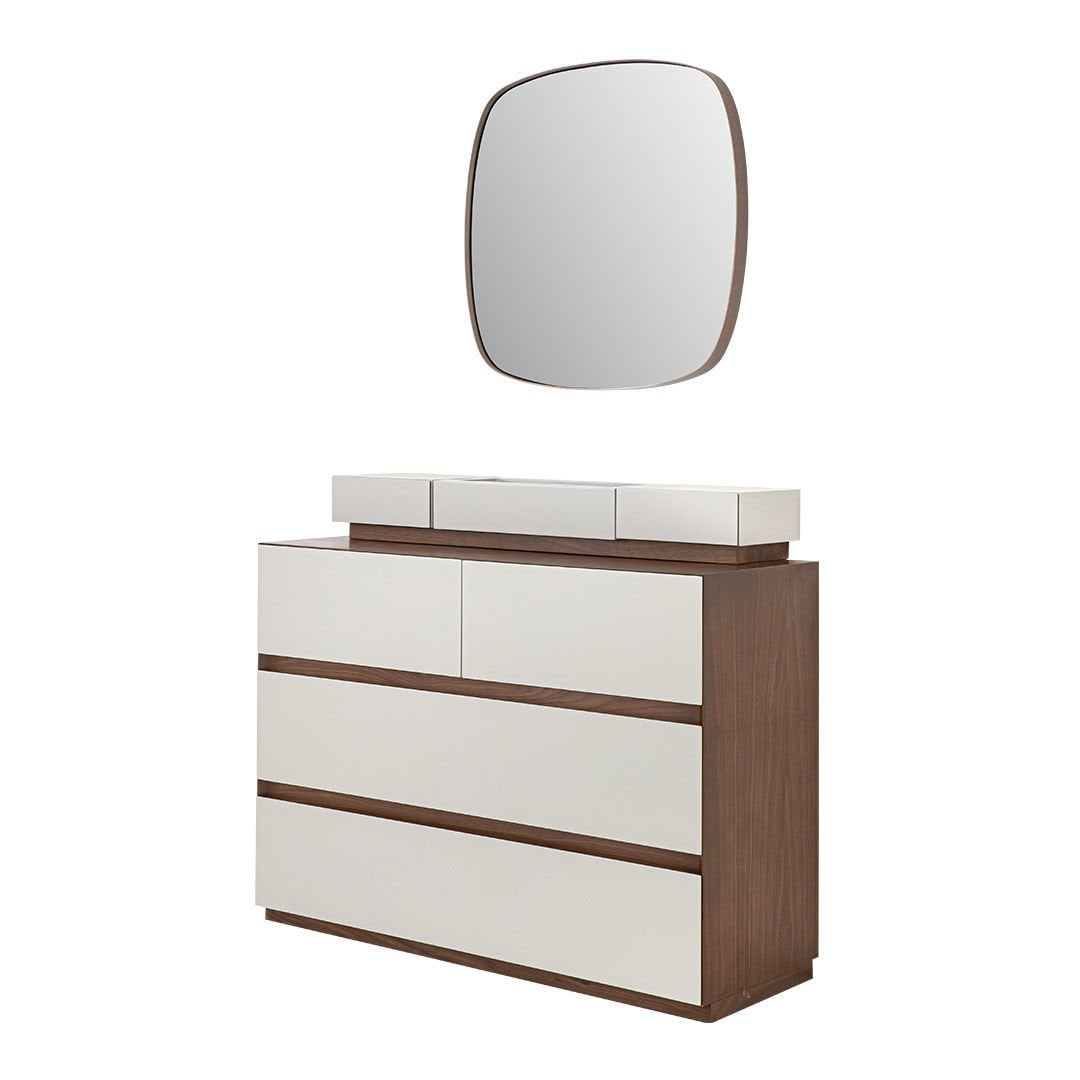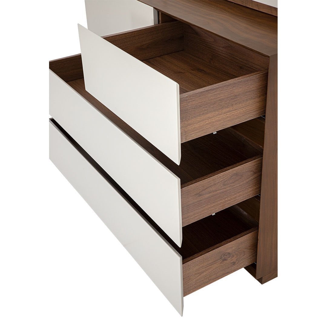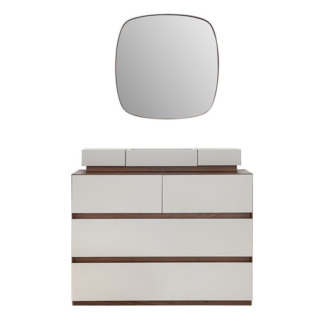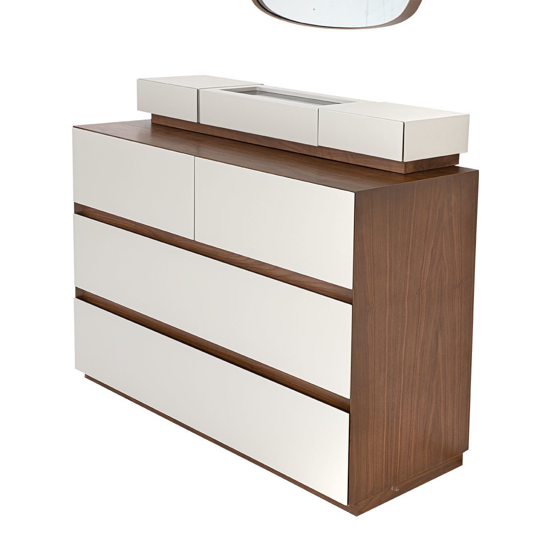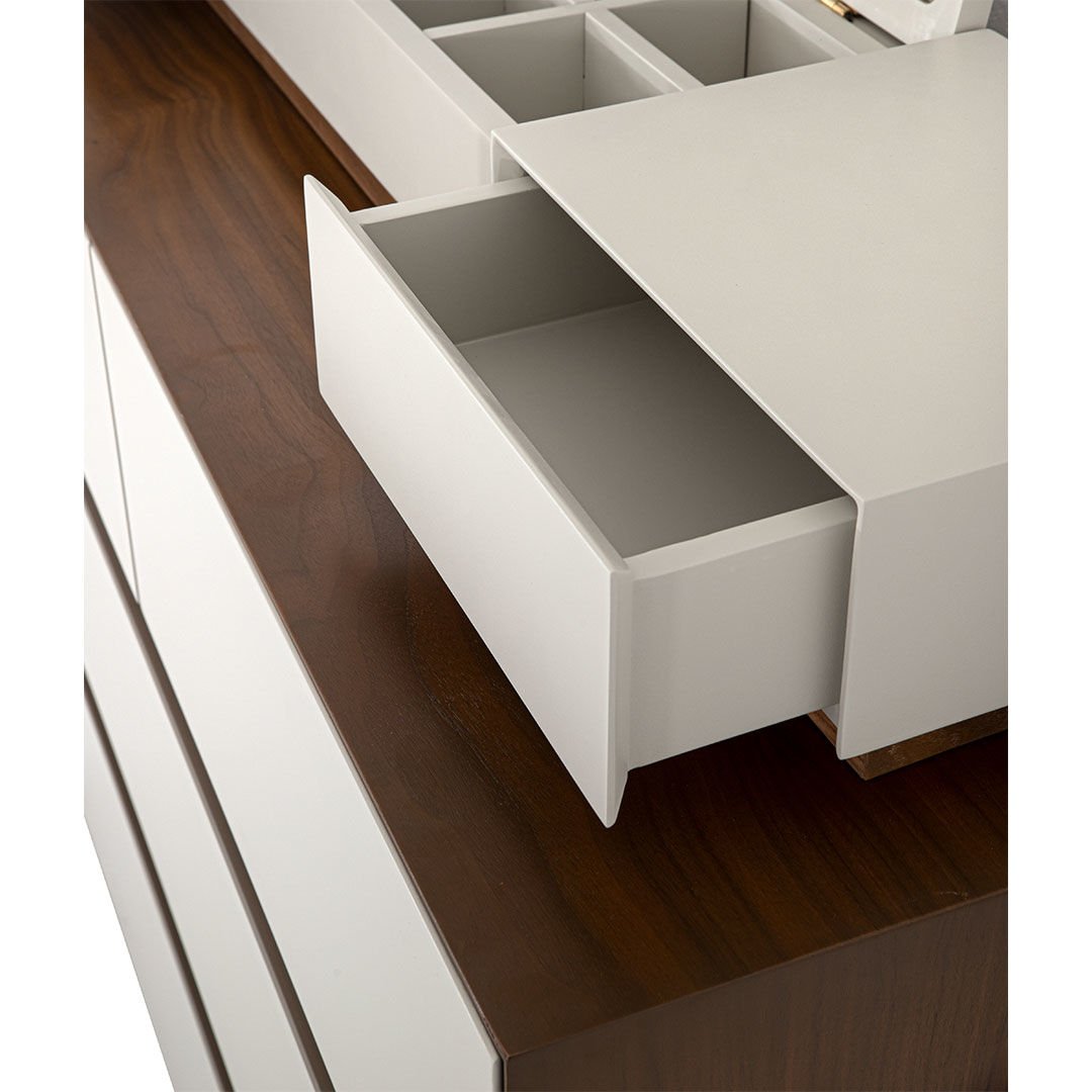 Ürün Malzemesi: Doğal hareli amerikan mat ceviz kaplama malzemeden üretilmiş olup çekmece ön yüzlerinde çakıl taşı mat lake mdf malzemeden kullanılmıştır.