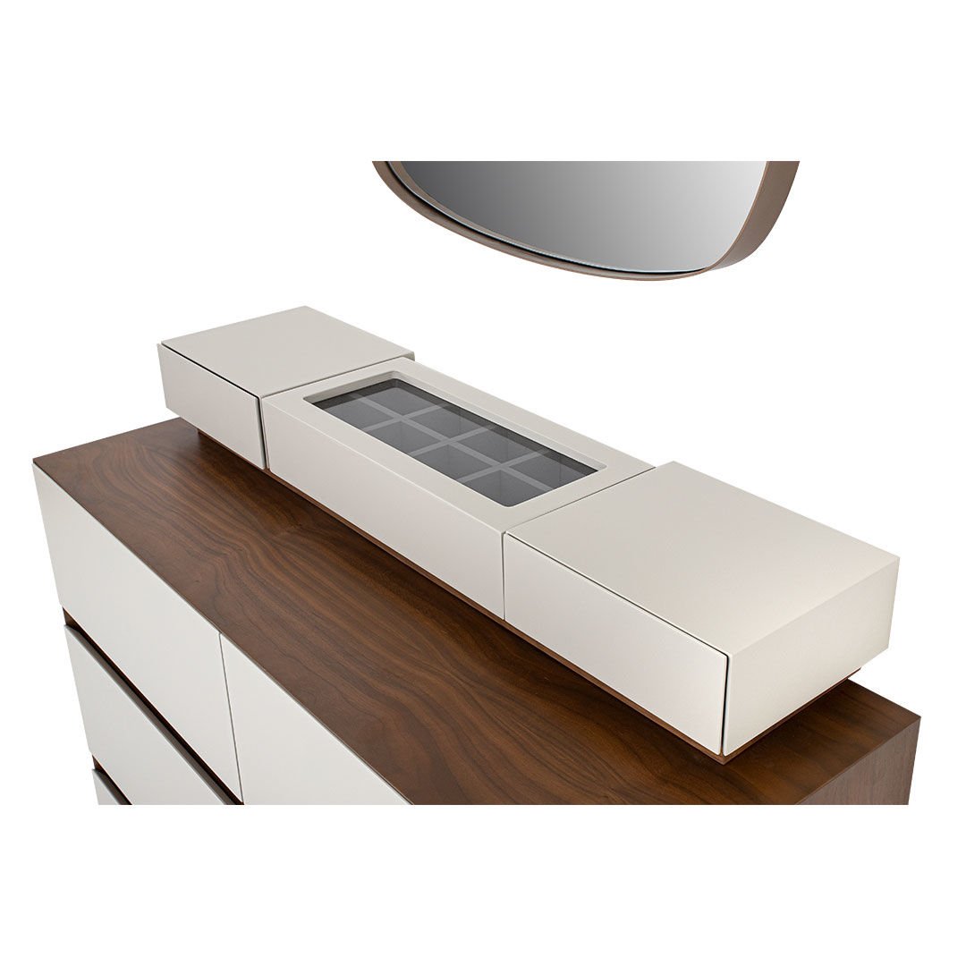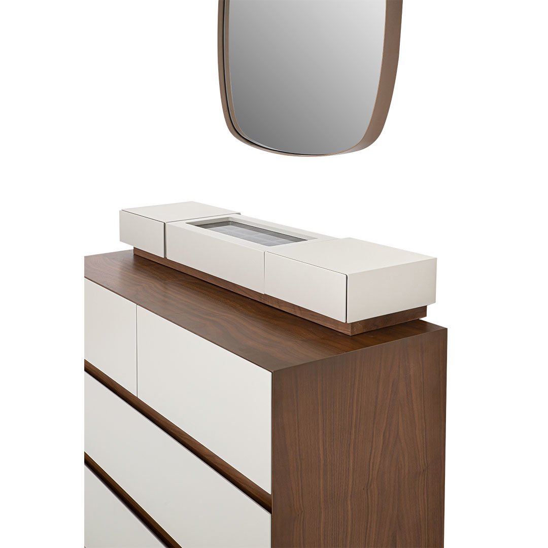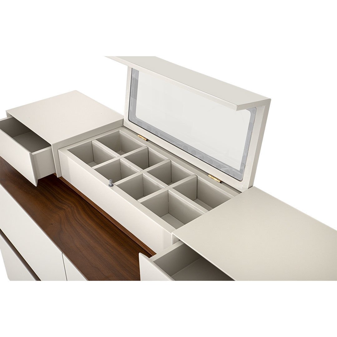 Hareli ceviz kaplamanın doğal estetiğini özgün malzeme kombini eriyle zenginleştiren Sacramento Şifonyer, göz alıcı tasarımı ve fonksiyonel özellikleriyle stilize bir mekan yaratıyor.