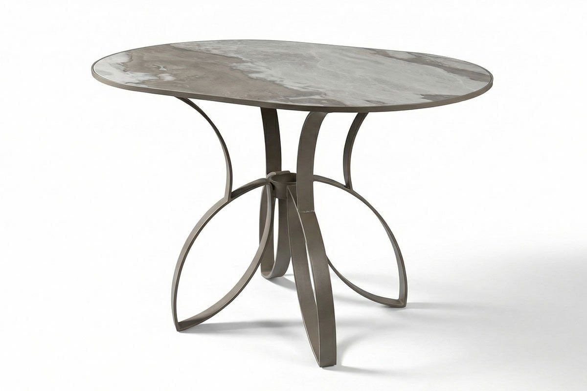 Ürün Malzemesi: Masanın üst tablası Gemma Bronze Porselen olup ayakları ise Mat Kül Beji Elektrostatik Boyalı Metal malzemeden üretilmiştir.