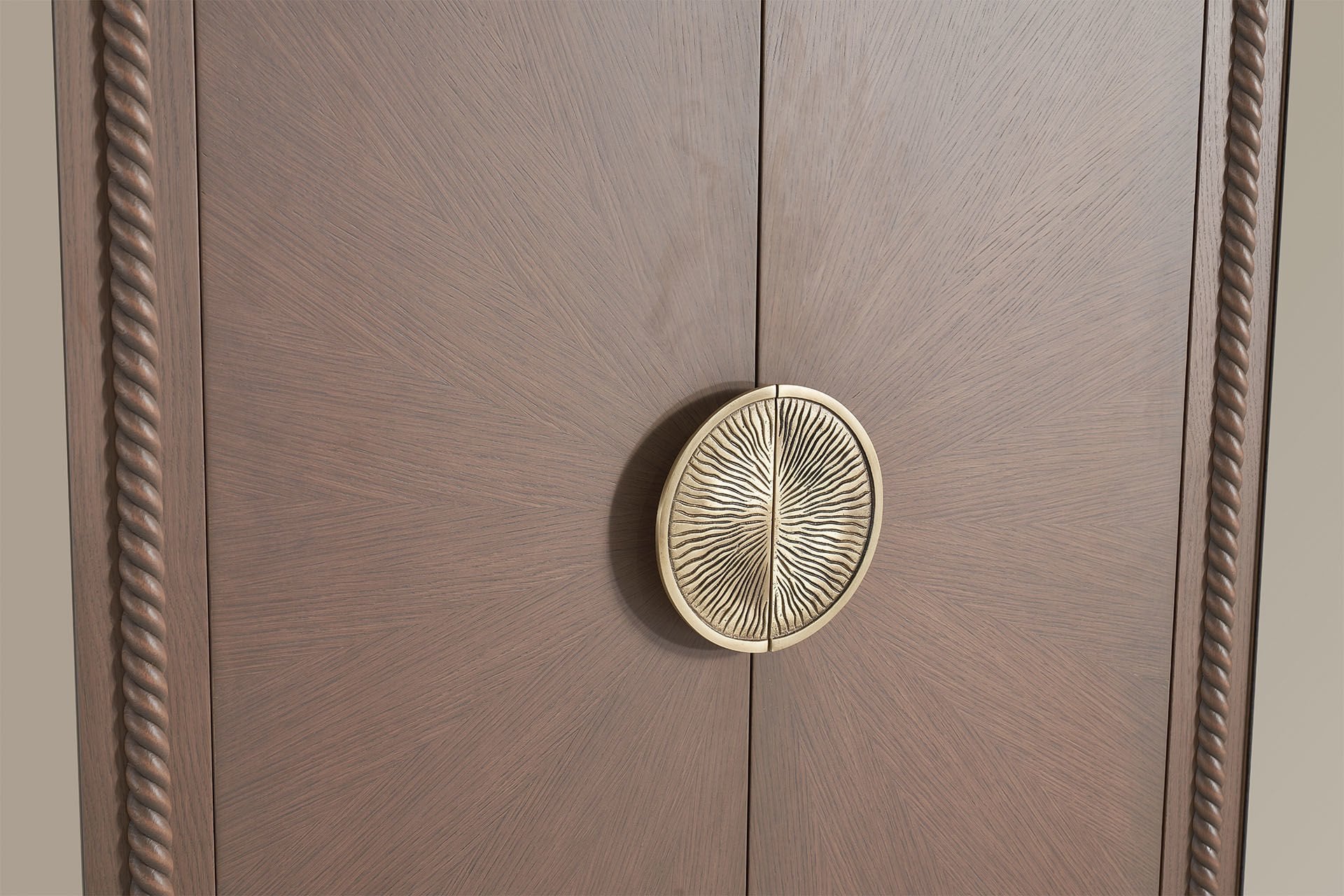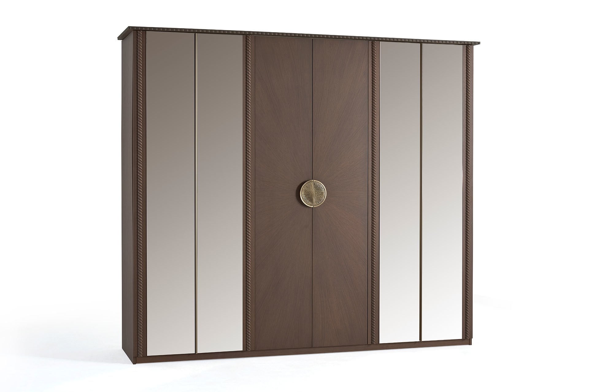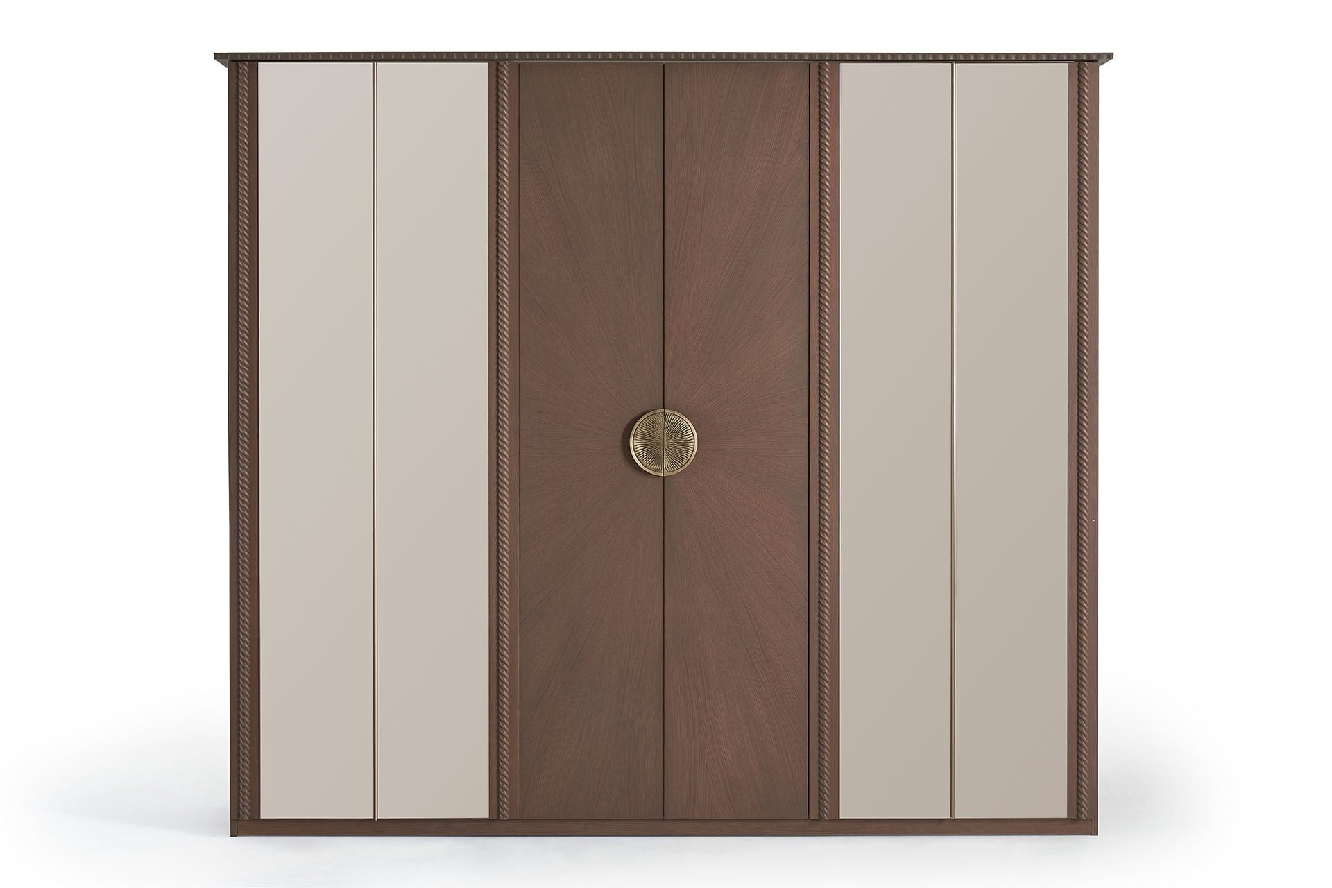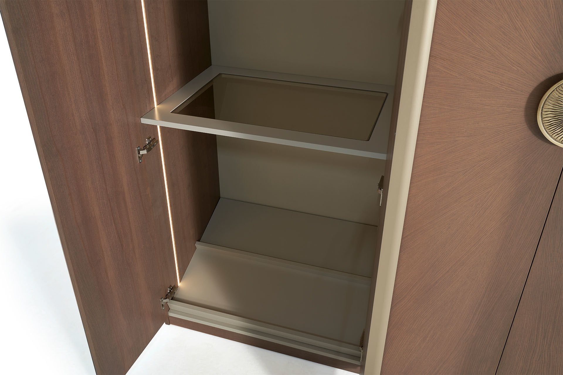 Dolap Malzemesi: Dolabın iki kapağı ve yan kısımları Coastal Hareli Meşe Doğal Ahşap Kaplama malzemeden üretilmiş olup, diğer dört kapakta bronz ayna kullanılmıştır. Dolap kulpları ise metalik kum beji elektrostatik boyalı metal malzemeden üretilmiştir.